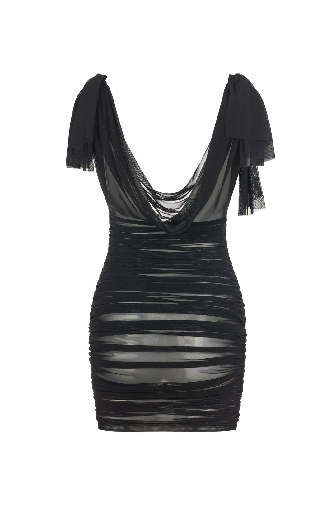 Мінімалістична чорна сукня з напівпрозорої сітки, що повторює лінії тіла та підкреслює жіночний силует.